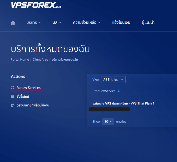 4.ที่หน้า Service Renewals จะแสดงบริการVPSที่เราใช้งานอยู่