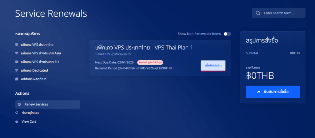 ให้เลือกไปที่ “เพิ่มในรถเข็น” ของVPSที่เราต้องการต่ออายุล่วงหน้า